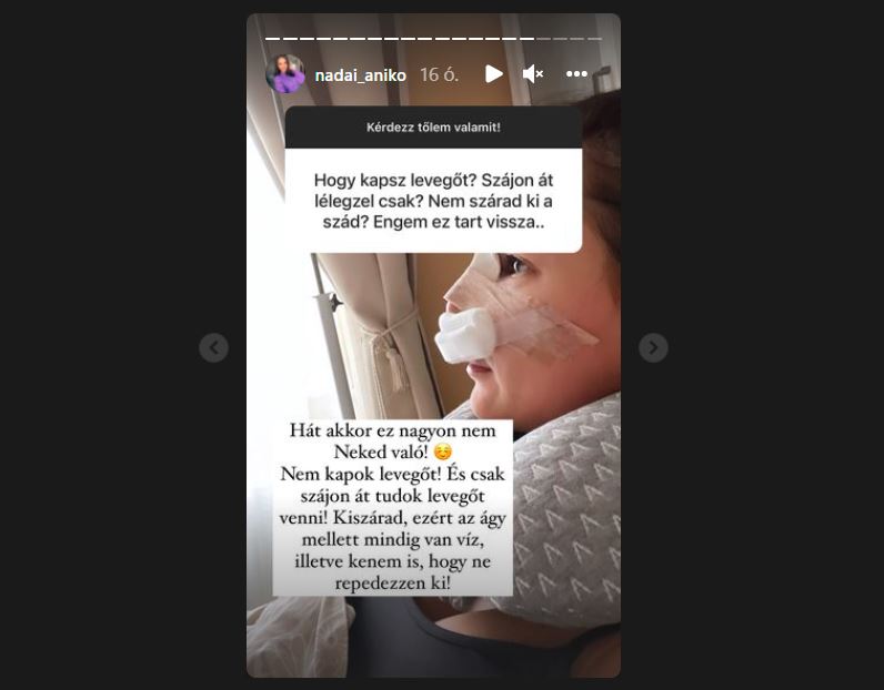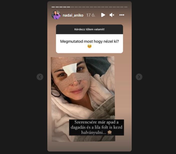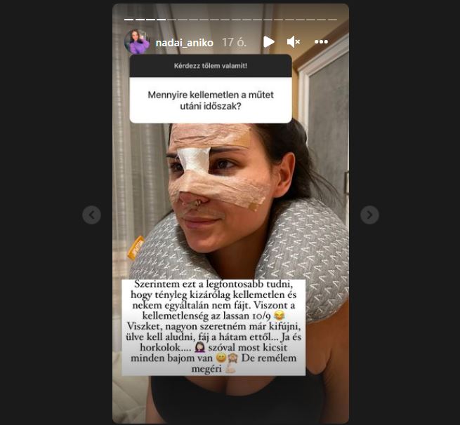 Nádai Anikó Insta-sztoriban mesélte el követőinek, hogy három órán át tartott orrműtétje, már jól van, és a lila foltok is halványulnak. Egy hét múlva veszik le a kötést, természetesen már nagyon várja. A műtét után egy hónapig szemüveget sem horhat, úgyhogy aki ilyesmin gondolkodik, csináltasson kontaktlencsét.