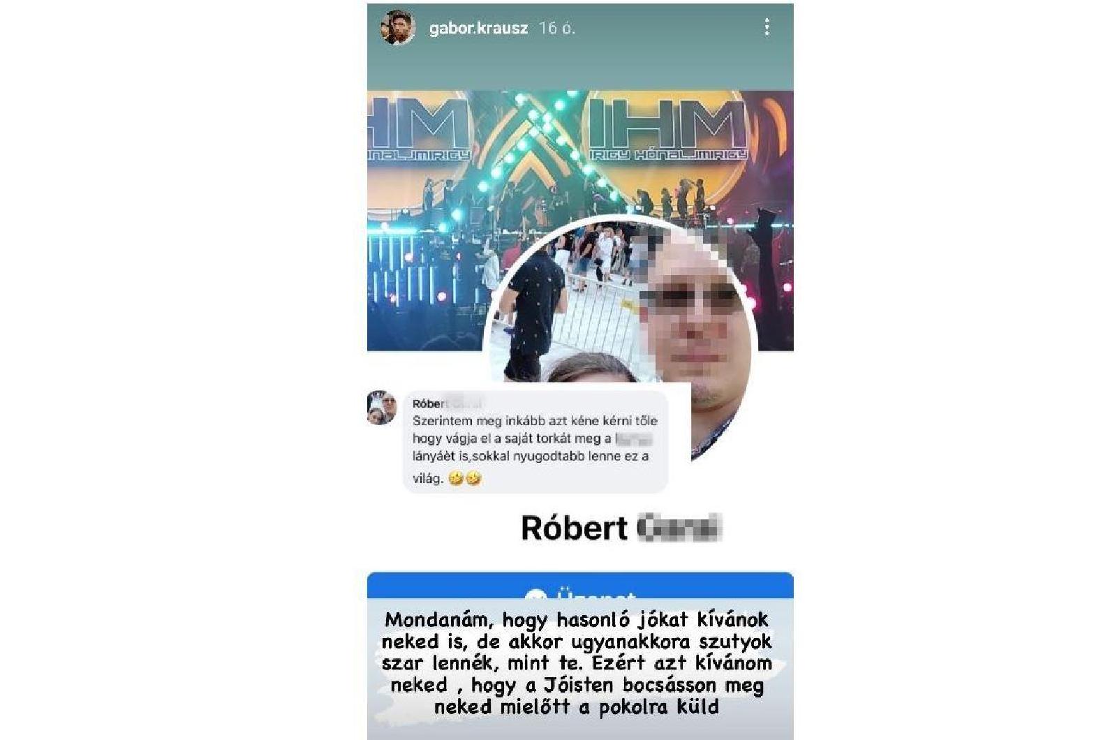 Krausz Gábor tegnap a közösségi oldalán osztott meg egy gyomorforgató üzenetet egy ismeretlen férfitől.