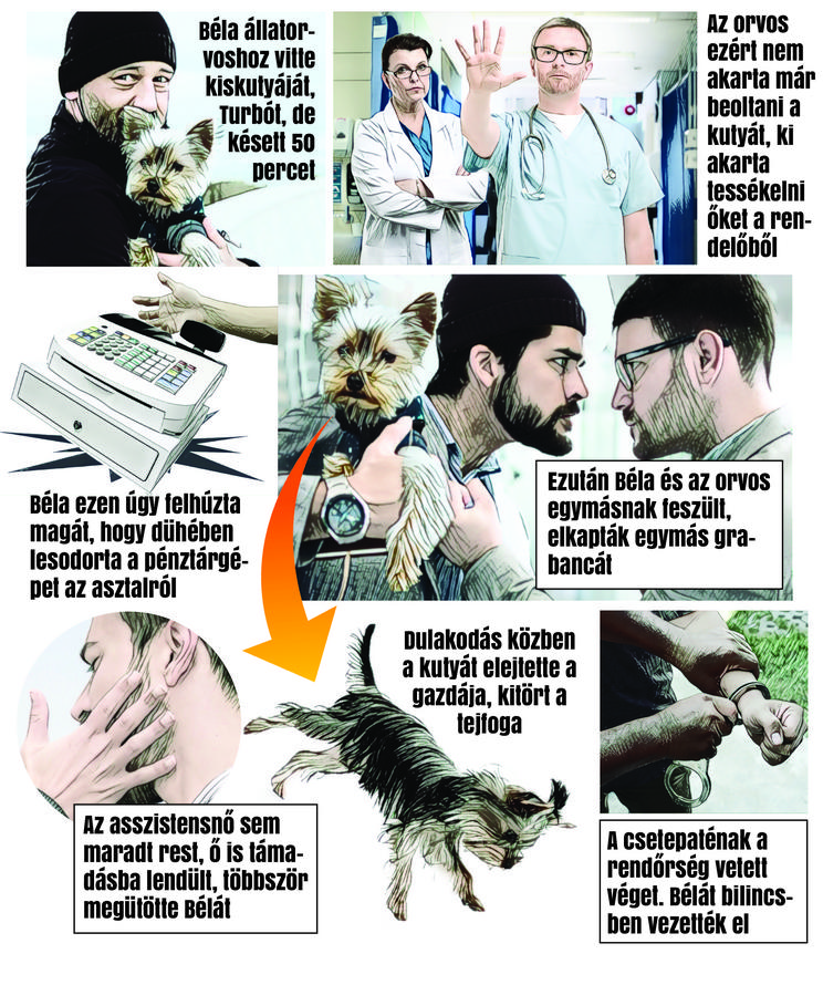 – Hibát követtem el azzal, hogy elkéstem, de azzal nem számoltam, ami ezután következett. A doktor, akit egyébként régóta ismerek, közölte velem, hogy most már nem oltja be Turbót. Majd hozzátette: menjek ki a rendelőből. Na akkor már én sem hagytam magam, mi az, hogy oltás nélkül csak úgy kitesz. Kértem a panaszkönyvet, de állítólag az nincs a rendelőben – mesélte felháborodva lapunknak Turbó kutya gazdája, P. Béla, aki nem tagadja: dühében a földre lökte a pénztárgépet. És innen tényleg elszabadult a pokol. – A doktor úr bezárta a rendelő ajtaját, hogy ne tudjak kimenni. Egymásnak feszültünk, ütés nem volt, csak megfogtuk egymás grabancát. Erre az asszisztensnő nekem jött és többször is erősen megütött. Közben szegény Turbó leesett és kitört a tejfoga – folytatta Béla.