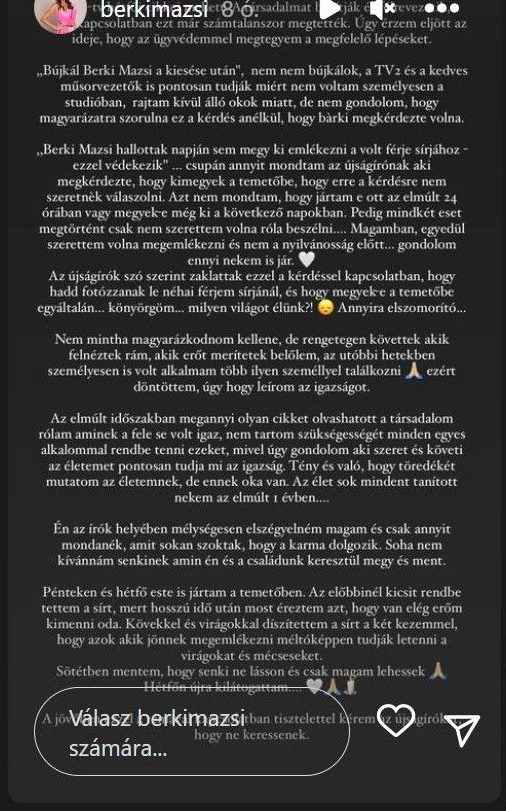 Az özvegy az egyik ideiglenesen elérhető Instagram-sztorijában kifejtette, hogy nagyon unja már az őt ért támadásokat, jogi lépésket tervez.