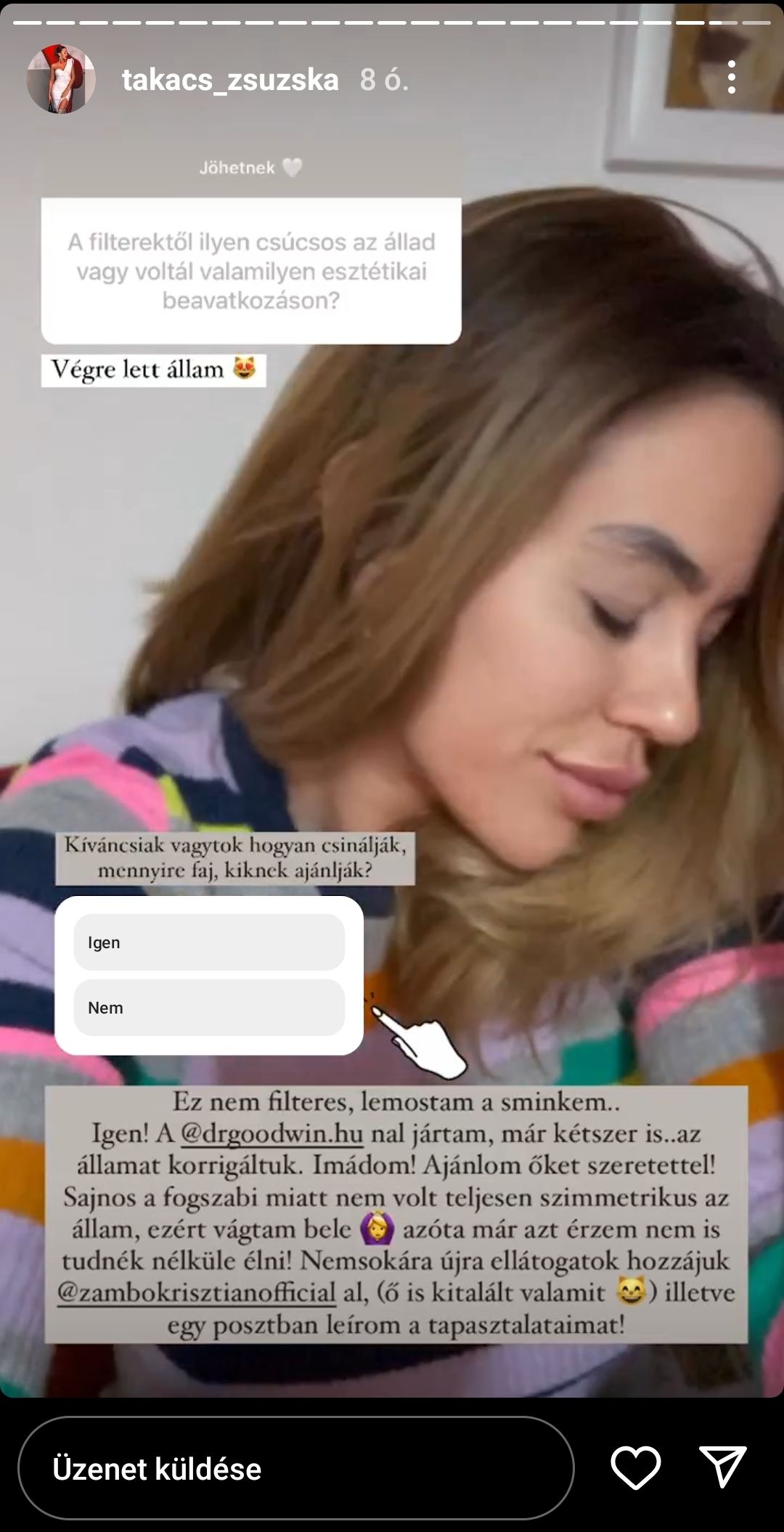 A követőknek feltűnt, hogy Zsuzsi álla nagyon kontúros lett, megváltozott. Rá is kérdezett az egyik rajongó: