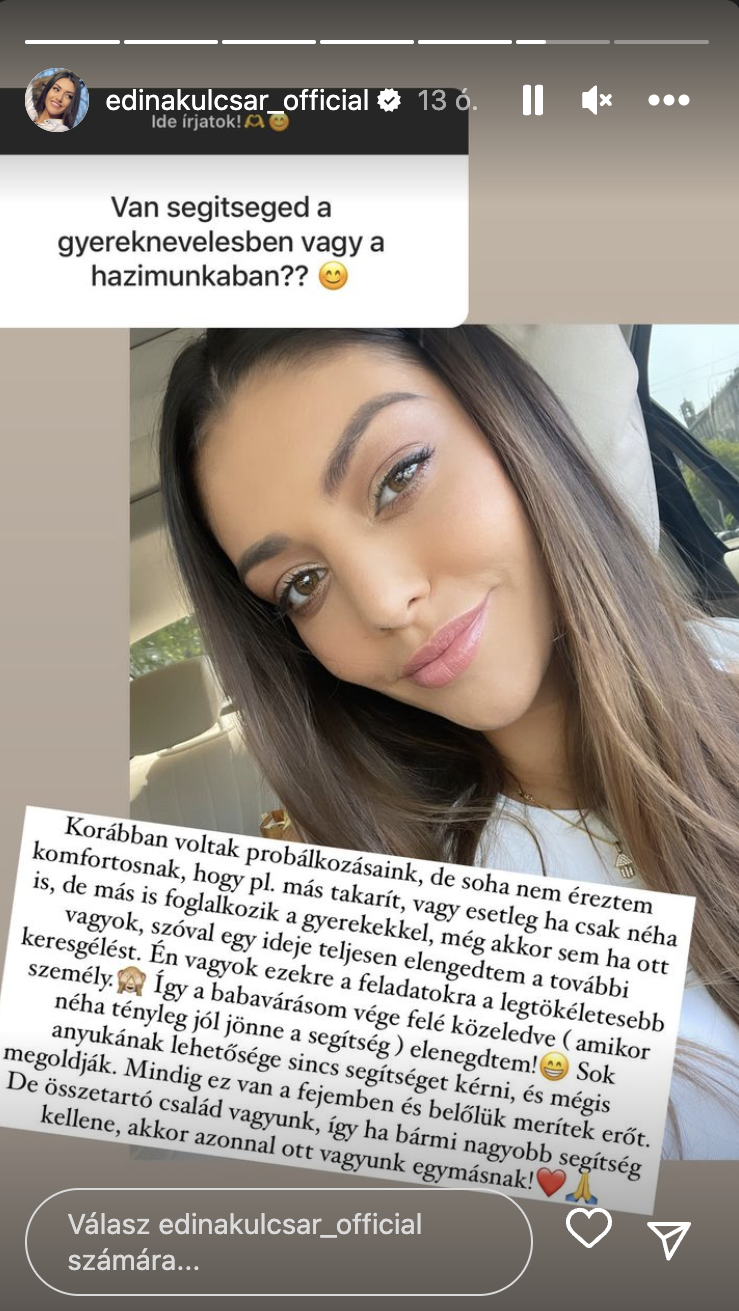 A korlátozott elérhető Instagram sztorijában arról érdeklődött az egyik követője, hogy van-e segítsége a gyermeknevelésben, vagy házimunkában. Edina ezt válaszolta: