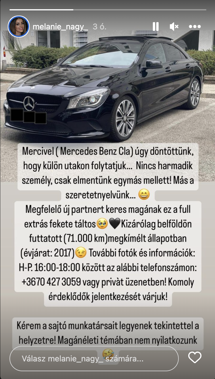 Minderre a megalázó gondolatsorra megérkezett Nagy Melanie csattanós válasza, amelyben G.w.M egykori szavait és gondolatait is összeszőve, utalva egy-két mostanában kirobbant botrányra, eladja az autót.