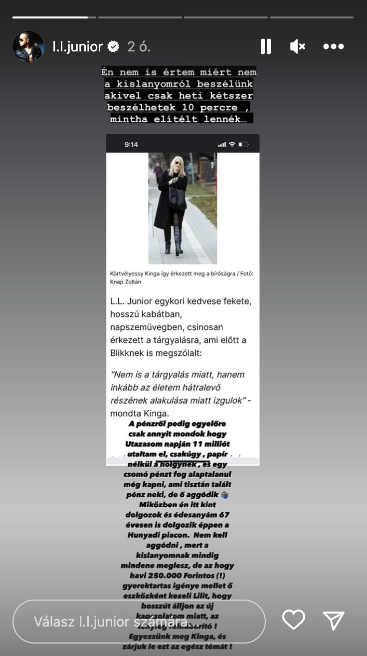 „Én nem is értem, miért nem a kislányomról beszélünk, akivel csak heti kétszer beszélhetek 10 percre, mintha elítélt lennék. A pénzről pedig egyelőre csak annyit mondok, hogy utazásom napján 11 milliót utaltam el, csak úgy, papír nélkül a hölgynek, és egy csomó pénzt fog alaptalanul még kapni, ami tisztán talált pénz neki, de ő aggódik. Miközben én kint dolgozom, és édesanyám 67 évesen is dolgozik éppen a Hunyadi piacon. Nem kell aggódni, mert a kislányomnak mindig mindene meglesz, de az, hogy havi 250 000 forintos (!) gyerektartás igénye mellett ő eszközként kezeli Lilit, hogy bosszút álljon az új kapcsolatom miatt, az tényleg felháborító! Egyezzünk meg Kinga, és zárjuk le ezt az egész témát!”
