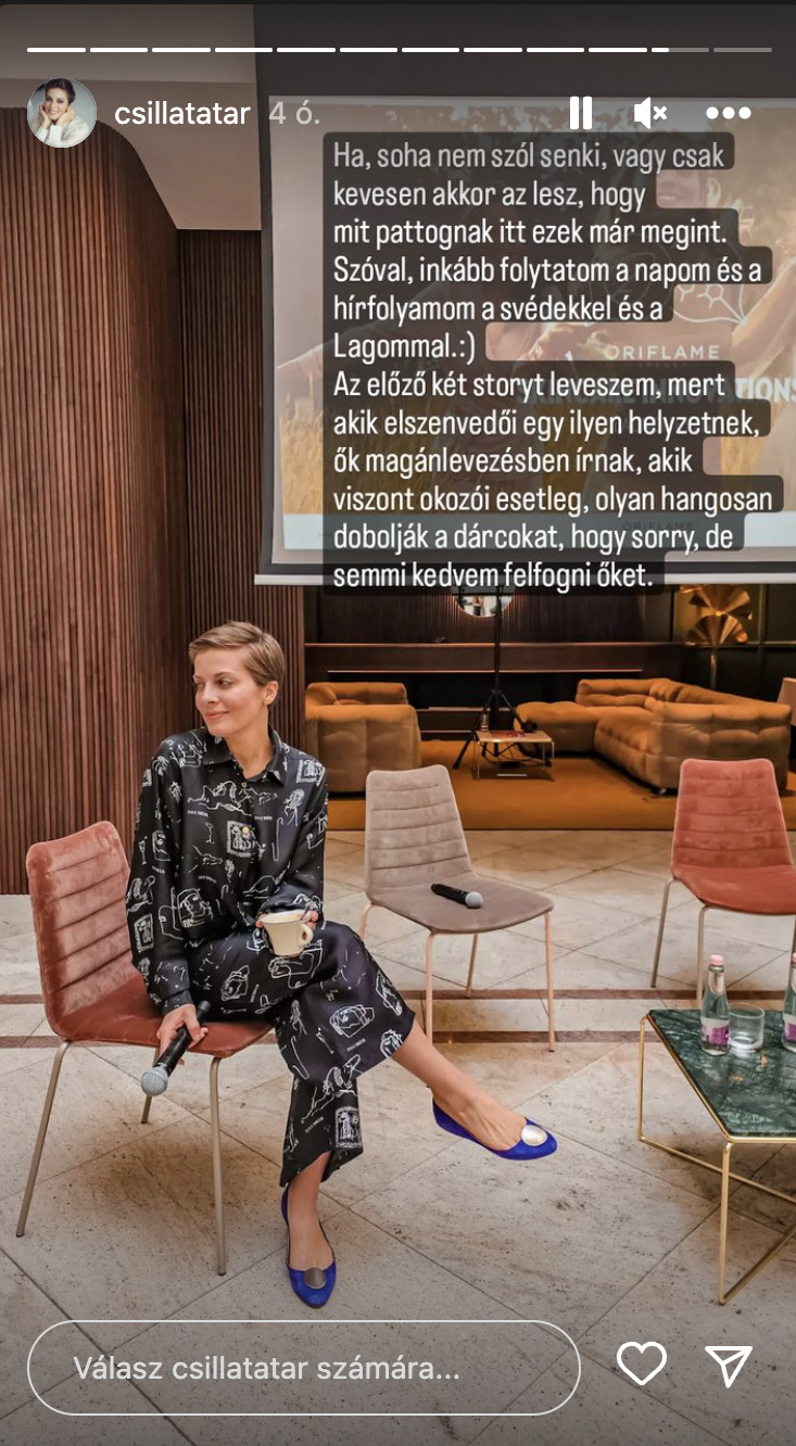 „És üzenem mindenkinek, aki a díjátadó alatt háttal állt a színpadnak, csivitelt, röhögött, magát fotózta, semmitmondó gif-eket készített a barinőivel, és sz*rt arra, hogy a műsorvezető, a díjazottak, a főszerkesztő éppen beszél.” – fakadt ki 24 óráig elérhető Instagram-történetében Csilla, ami rövid időn belül a Redditen kötött ki. Egy következő történetben így folytatta: „Teljesen nyilvánvaló, hogy nem azért jöttek, hogy ünnepeljék mások munkáját, szorgalmát, tehetségét, nem azért jöttek, hogy büszkén lehessenek, részesei legyenek sikeres nők történeteinek, hanem azért, hogy a tökéletes ruhafotó elkészülhessen a fotófal előtt, amire aztán rá lehet majd tenni a #womanpower hashtaget, mert az mennyi menő már. A szellemi restség magasiskolája.”