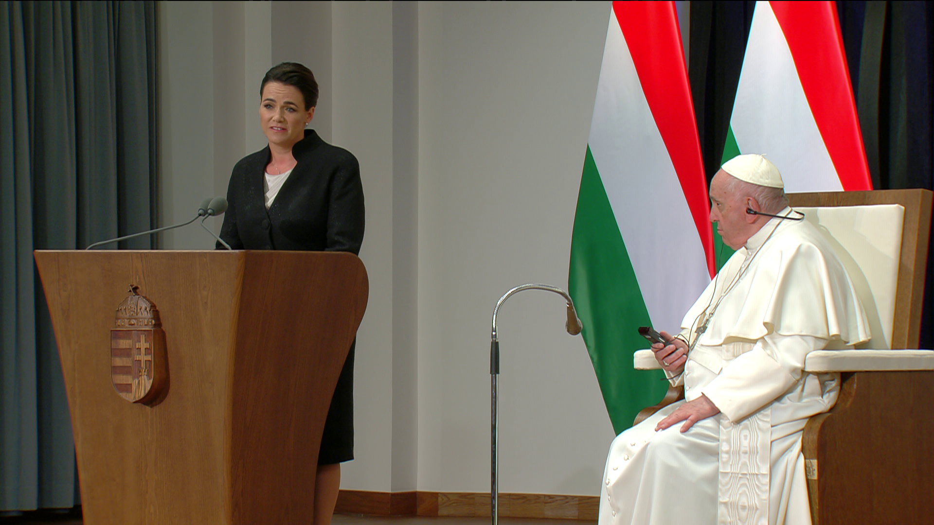 „Szentséges Atya, Isten hozta önt, a béke emberét Magyarországra. Mi, magyarok így köszöntjük a kedves vendéget. Ennek a köszöntésnek van egy mélyebb, magasabb értelme. Hisszük, hogy a szentatya érkezése nem véletlen. Több, mint a Magyar Katolikus Egyház és a magyar állam meghívása. Őszentsége érkezése Kairosz. Isten megfelelő időben összehozza és erővel vértezi fel azokat, akik bíznak a szeretet, az összefogás és a béke erejében. Mi, magyarok abba a magasságba akarunk felemelkedni, ahol Krisztus híveinek és minden békét kereső ember összetartozását megtaláljuk. Azt szeretnénk, ha a szentatya látogatása elrugaszkodás lenne a felemelkedéshez, ahonnan rálátunk a békéhez vezető útra. A megfelelő úton már nekünk, magyaroknak, európaiaknak kell végigmennünk. II. János Pál pápa is akkor jött el hozzánk, amikor arra a legnagyobb szükségünk volt, a kommunizmus bukása után. Szentséged megerősít minket abban, hogy a keresztény értékeken nyugvó életnek van alapja, értéke a XXI. században is. Ezt megerősítjük mi is. Deklaráltuk az Alaptörvényben is, hogy Magyarország védi a család szentségét, az anya nő, az apa férfi. A magzatot a fogantatástól kezdve védelem illeti meg. Szövetségünknek súlyos, tragikus közvetlenséget ad a szomszédban dúló véres háború. Fájdalommal és reménnyel fordulok szentségedhez. Mi, magyarok szinte tapintani tudjuk a háború drámaiságát. Halljuk a kárpátaljai magyar anyák sírását és jajkiáltását is. Mi, édesanyák elsősorban a békét akarjuk megnyerni, nem a háborút. Hol vagyunk még a békéhez vezető úttól? Hol a felismerés, hogy a háborút hűteni kell, és nem fűteni? Önben világszerte a béke emberét látják. Bízunk benne, hogy mindenkivel beszélni tud, aki nélkül nem lehet béke. Arra kérjük, hogy járjon el a mielőbbi, igazságos béke érdekében. A háború útját vér, halál és egyre mélyülő szegénység övezi. Nekünk, magyaroknak a történelmünk több, csodálatos példát mutató szentet adott. Bienvenido, isten hozta el önt hozzánk!”