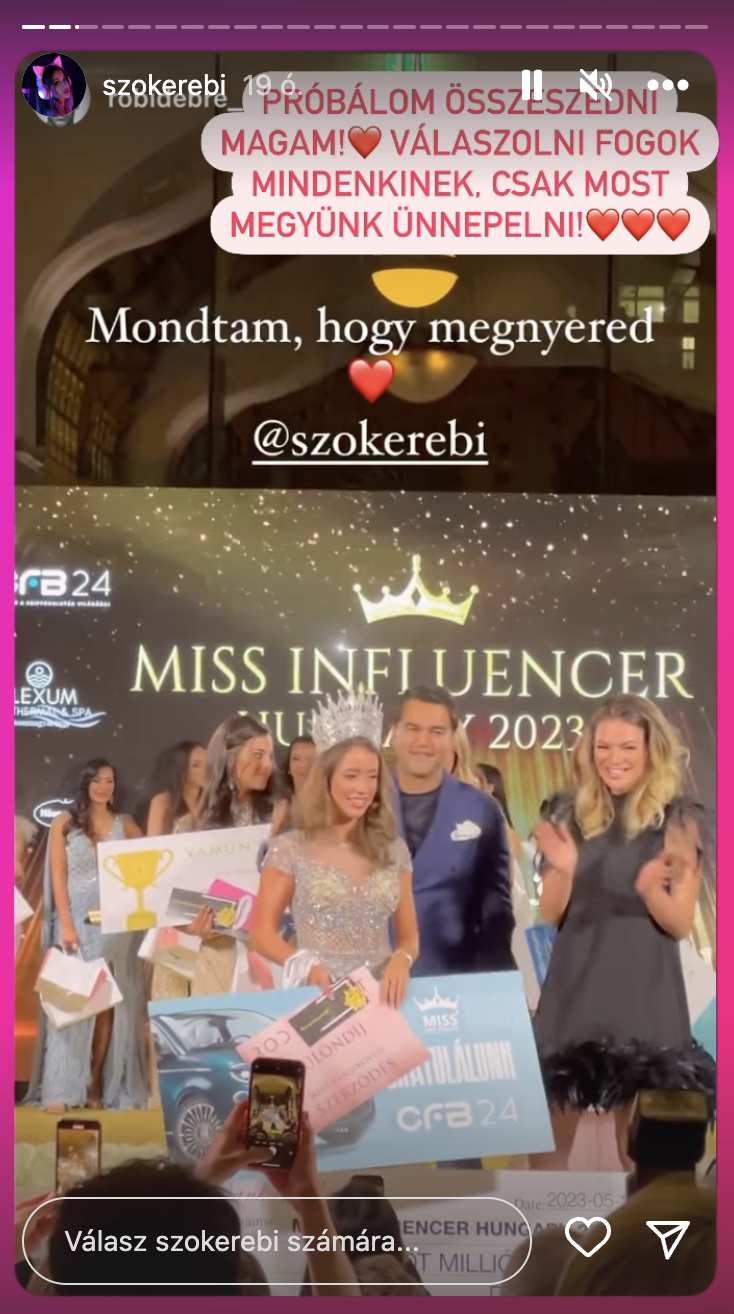 Az egykori szépségkirálynő, Nagypál Kriszti is jelen volt, aki Instagram-sztorijában osztotta meg, hogy Szarvas Andi lett a második helyezett és a 25 éves Szőke Rebeka a győztes. Rebeka egy csillogó koronát kapott, az első udvarhölgy pedig Jerkovics Bogi lett. Rebeka az Instagram-sztorijában osztott meg egy videót a díjátadóról, melyen a győzelmére adott érzelmes reakciója látható.