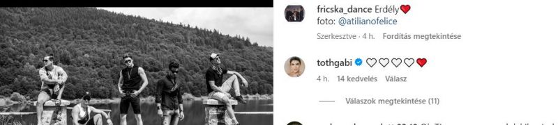 Tóth Gabi még a látszólag boldog időkben kommentelt a Fricska Táncegyüttes egyik fotójához. Mindenki fehér szívet kapott, egyvalaki azonban pirosat. Az olvasó fantáziájára bízzuk, hogy kitalálja, ki a szerencsés… Hát persze! Aki nem emlékezne a sztorira, annak mutatjuk a fotót.