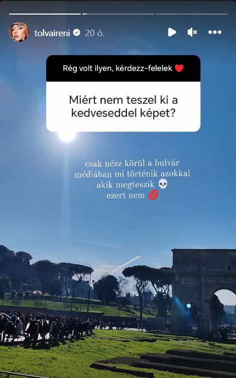 Tolvai Reni gyakran játszik kérdezz-felelek játékot a rajongóival, a napoban pedig újra sort kerített egy ilyenre, amelyben az egyik rajongója konkrétan megkérdezte, hogy miért nem mutatja be a párját a nyilvánosság előtt. Reni teljesen őszintén válaszolt, amellyel egyébként elismerte, hogy valóban újra megtalálta a szerelem, a fotó szerint épp Rómában vannak a párjával. Fotót pedig azért nem mutat róla, mert nem szeretné kitenni a bulvársajtó fokozott érdeklődésének. Új album, új szerelem: 2024 Tolvai Reni éve lesz!